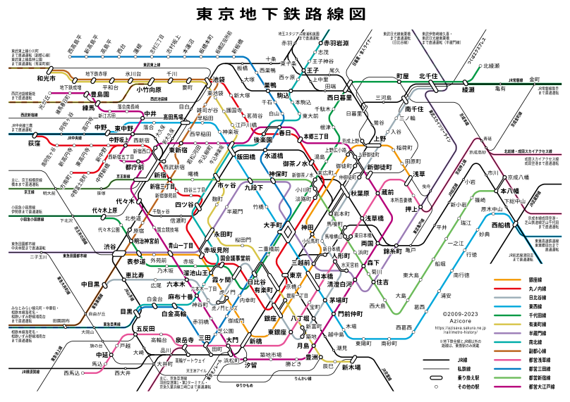 当サイトの路線図では、地下鉄各線とJR線(旧国鉄、国有鉄道)以外の私鉄路線は、乗り換え駅と終端駅以外の駅は省略していますので、ご注意下さい。また、新幹線と軌道線類(東急世田谷線、都電荒川線とかつての路面電車)は、デザインの都合上、開業していても記載されていませんので、ご注意下さい。